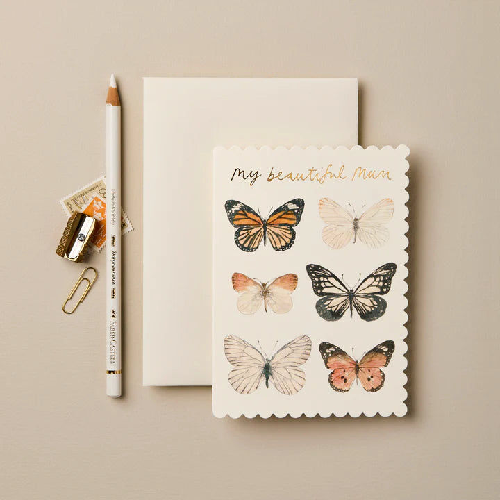 Butterfly ‘My Beautiful Mum’ Card | Scalloped Edge Mini Card with Gold Foil & Cream Envelope | UK Printed Stationery